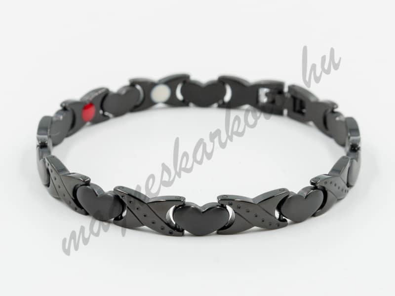 Orvosi rozsdamentes acélból készült, fekete női karkötő. Mágnesbetéteket, germániumot, valamint negatív ionos és infravörös kerámia betéteket tartalmaz.