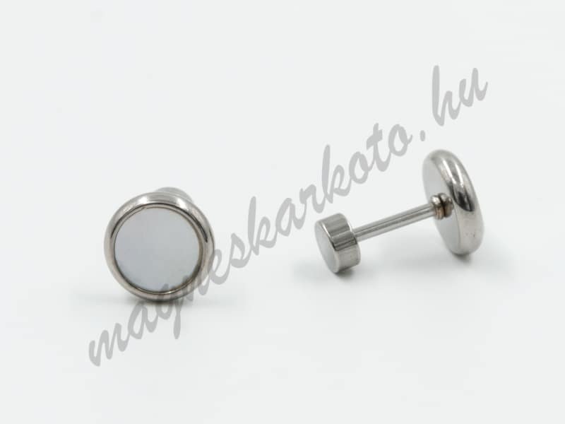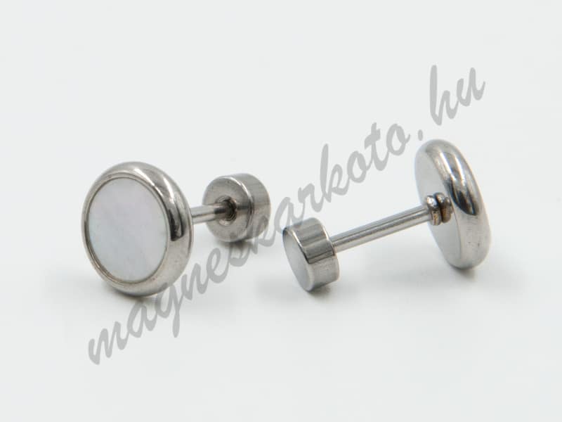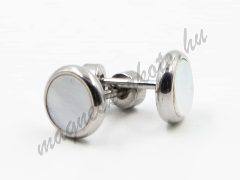 Orvosi rozsdamentes acélból készült ezüst színű bedugós fülbevaló, világos, gyöngyház jellegű berakással.