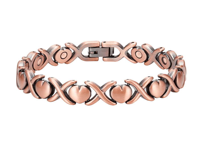 Vörösrézből készült női karkötő, szív formájú szemekkel, mágnesbetétekkel.