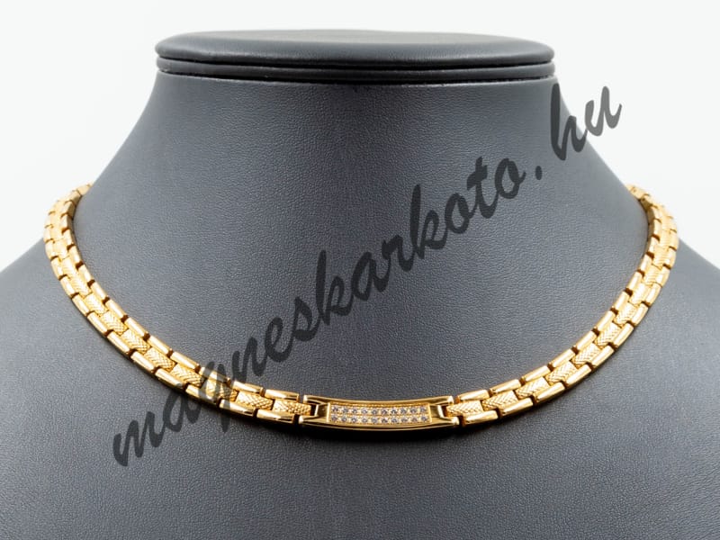 Orvosi rozsdamentes acélból készült női nyaklánc, galvanizált arany bevonattal. Mágnesbetéteket, valamint germániumos, negatív ionos és infravörös sugarakat kibocsátó kerámia betétet is tartalmaz.