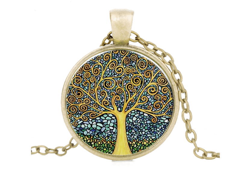 Nagyon szép életfa medál domború üveggel. Bronz színű lánccal. A medál mérete 27mm. A lánc hossza 50cm+6cm.