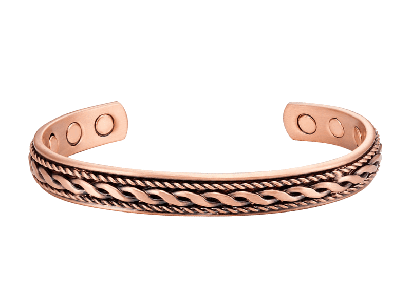 Klasszikus csavart motívummal díszített vörösréz karkötő, 6 db mágnesbetéttel.