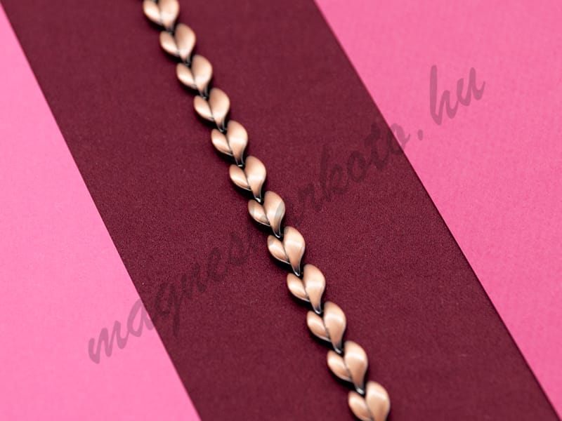 Vörösrézből készült női karkötő, mágnesbetétekkel, levél formájú szemekkel.