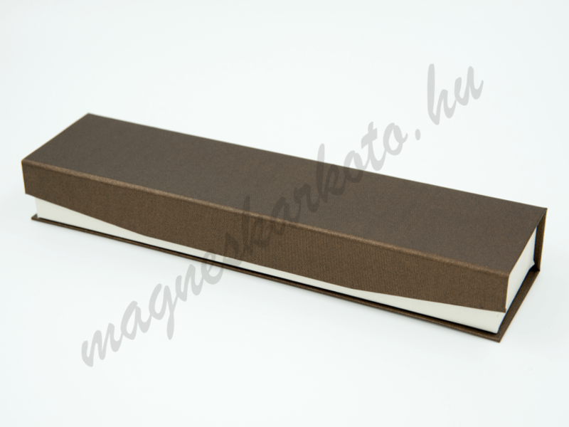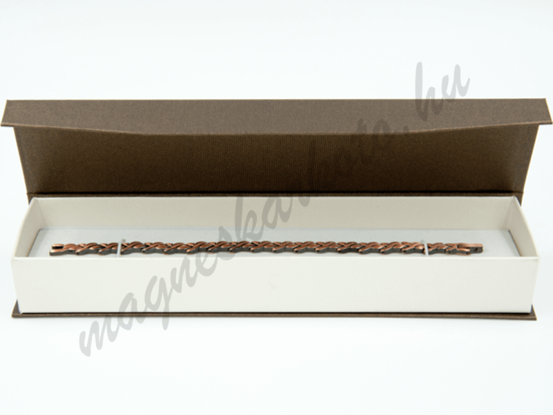 Luxus kivitelű, csillogó fényű, rendkívül erős, sötétbarna-törtfehér karlánc doboz texturált felülettel, mágneszáras megoldással. Kétoldalú, megfordítható, fekete-fehér betéttel.
