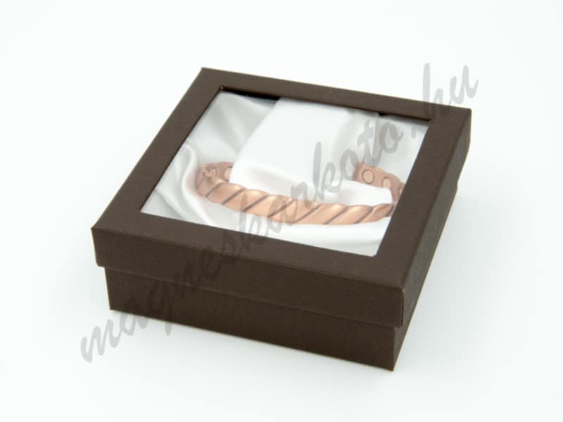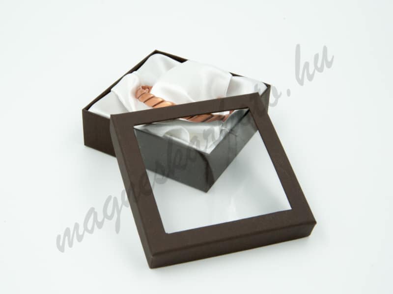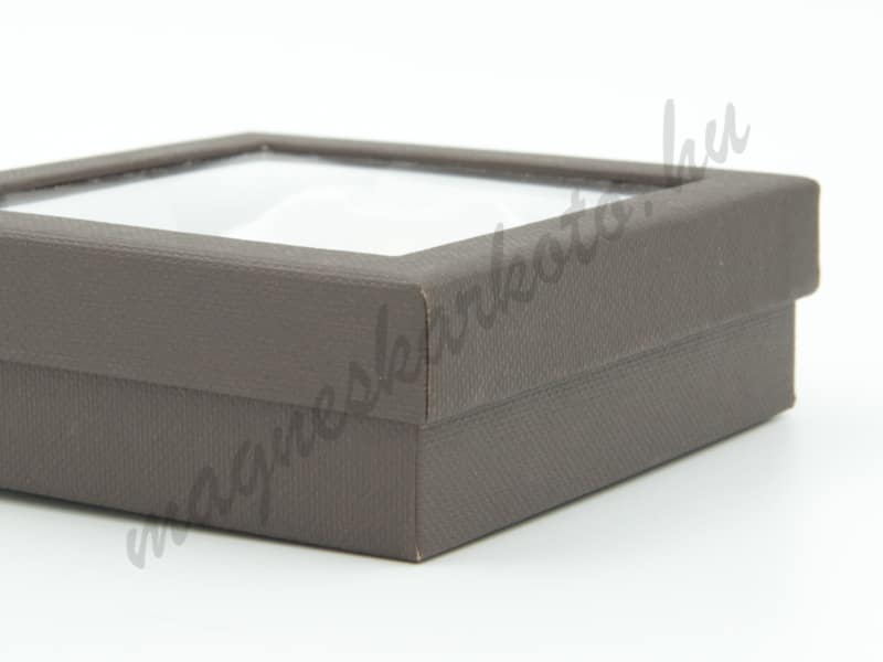 Erős, sötétbarna karperec/óradoboz matt, textil hatású felülettel, selyemhatású textilbelsővel. A doboz tetejének jelentős része átlátszó, erős műanyag.
