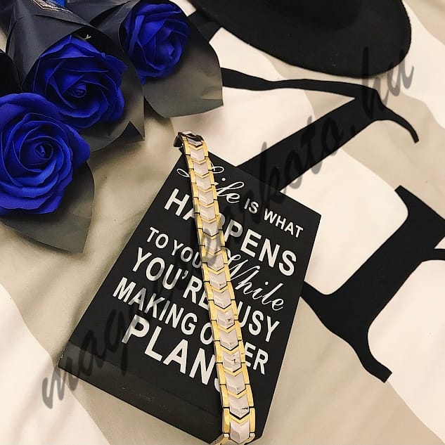 2) mágnes-, germánium-, negatív ionos és infravörös kerámia betéteket is tartalmazó változatban. Ennek hossza 22.5 cm, és szükség esetén bővíthető. A karkötő teljes felülete fényes, ahogy a termékképeken is látszik.