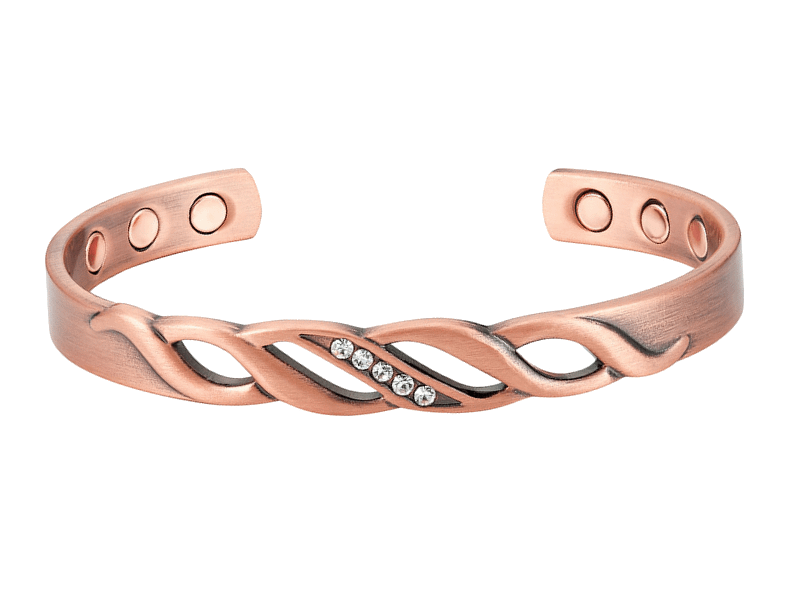 Különleges vörösréz karperec, strasszkövekkel díszítve.